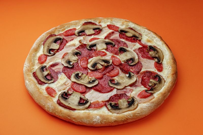 Моцарелла, фирменный томатный соус, салями, ветчина, охотничьи колбаски, копчёная курица, шампиньоны, базилик.
